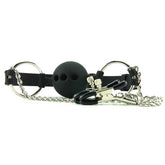 Hinder Breathable Silicone Ball Gag With Nipple ClampsThis breathable ball gag allows you to restrict the speech of your plaything, while still allowing them to breathe easily. The smooth silicone ball is tasteless and odorless, and large enough to gag them completely yet comfortably. The adjustable strap is made from soft,...