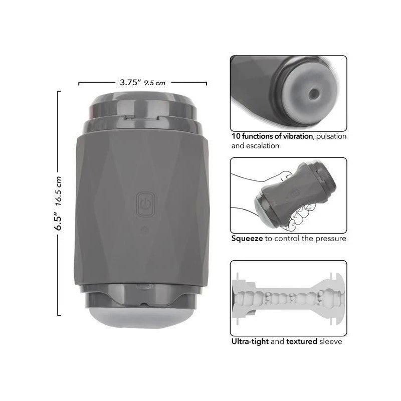 The California Exotics Milk Master Vibro Squeeze offers a self-contained dual-ended stroker with 10 intense vibration functions. Featuring a squeeze-controlled pressure system, ultra-tight textured sleeve, and waterproof design, it's USB rechargeable for convenience and includes a travel lock for discreet use.