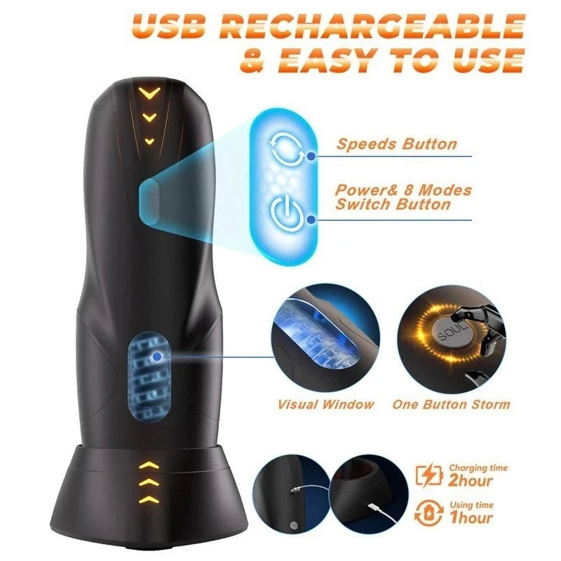After charging, insert the sleeve using the magnetic guides. Apply water-based lubricant, then activate your desired thrust and rotation modes. Use the βSoulβ button for an intense climax boost. Watch the thrusts through the visual window while the LED band pulses, enhancing the sensory experience from every angle.
