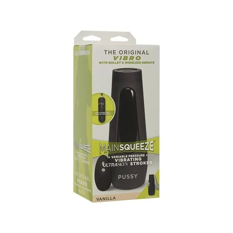 Experience intense pleasure with the Main Squeeze Vibro Pussy Masturbator. This ULTRASKYN stroker features a lifelike pussy opening, a 9-function vibrating bullet with a wireless remote, adjustable suction, and a squeezable grip for total control. Fully disassembles for easy cleaning.